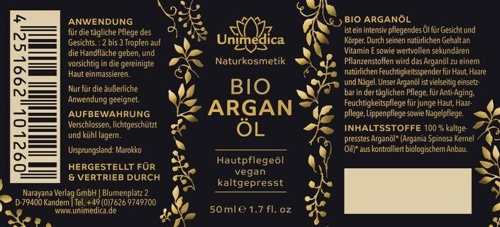 BIO Arganöl von Unimedica ist ein intensiv pflegendes Öl für Gesicht und Körper. Durch seinen natürlichen Gehalt an Vitamin E sowie wertvollen sekundären Pflanzenstoffen wird das Arganöl zu einem natürlichen Feuchtigkeitsspender für Haut, Haare und Nägel.