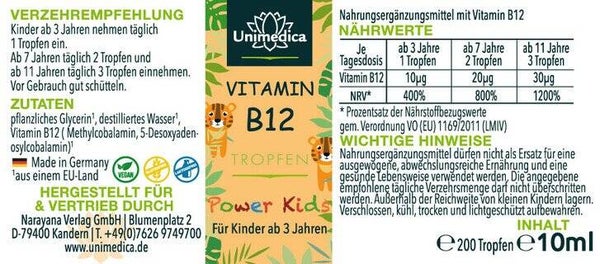 Power Kids Vitamin B12 Tropfen von Unimedica ergänzen den Vitamin B12 (Cobalamin) - Vorrat bei Kindern ab 3 Jahren. Vitamin B12 ist wichtig für eine ganzheitlich gesunde Entwicklung der Kinder. Denn B12 ist an zahlreichen wichtigen Stoffwechselprozessen im Körper beteiligt: