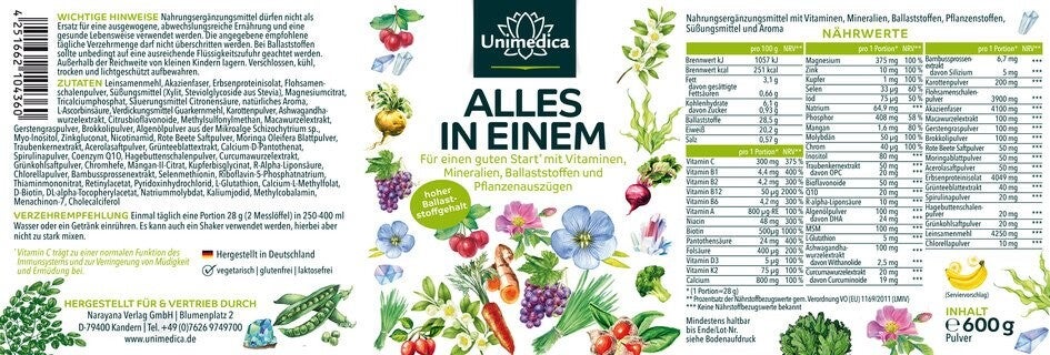 „Alles in einem“ von Unimedica wird in zertifizierten Anlagen in Deutschland aus hochwertigen Rohstoffen hergestellt und ist für die vegetarische Ernährung geeignet. Das Pulver lässt sich mit dem beiliegenden Messlöffel leicht dosieren. Jede Dose „Alles in einem“ von Unimedica enthält 600 g Pulver. Das entspricht ca. einem 3-Wochenvorrat.