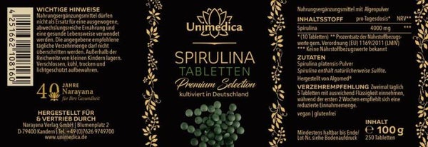 Spirulina Premium Selection - 4000 mg pro Tagesdosis (10 Tabletten) - kultiviert in Deutschland - 250 Tabletten - von Unimedica