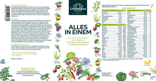 Alles in einem von Unimedica wird in zertifizierten Anlagen in Deutschland aus hochwertigen Rohstoffen hergestellt und ist für die vegetarische Ernährung geeignet. Das Pulver lässt sich mit dem beiliegenden Messlöffel leicht dosieren. Jede Dose Alles in einem von Unimedica enthält 840 g Pulver. Das entspricht ca. einem 4-Wochenvorrat.