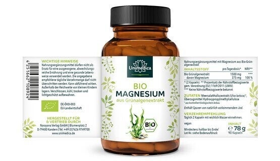 Bio Magnesium - aus Grünalgenextrakt - 375 mg pro Tagesdosis (2 Kapseln) - 90 Kapseln - von Unimedica