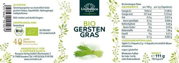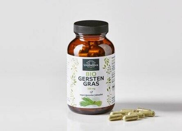 Unsere Kapseln bestehen aus in Deutschland biologisch angebautem Gerstengras. Gerste ist ein Süßgras, basisch und glutenfrei. Das Gerstengras wird wenige Wochen nach dem Auskeimen geerntet, schonend bei niedriger Temperatur getrocknet und fein zu Gerstengraspulver vermahlen. Umhüllt von einer pflanzlichen Kapselhülle aus Cellulose sind die Bio Gerstengras-Kapseln von Unimedica Natur pur.