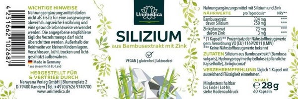 Silizium aus Bambusextrakt mit Zink Kapseln von Unimedica sind frei von Zusätzen wie Farbstoffen, Stabilisatoren, Konservierungsstoffen, Trennmitteln wie Magnesiumstearat sowie gentechnikfrei, laktosefrei, glutenfrei und vegan.