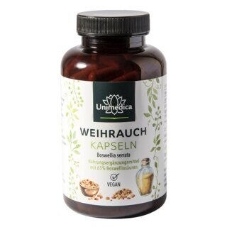 Weihrauchkapseln von Unimedica werden schonend aus natürlichen, hochwertigen Rohstoffen gewonnen. Frei von GMO und in höchster Qualität. Für Veganer und Vegetarier geeignet.