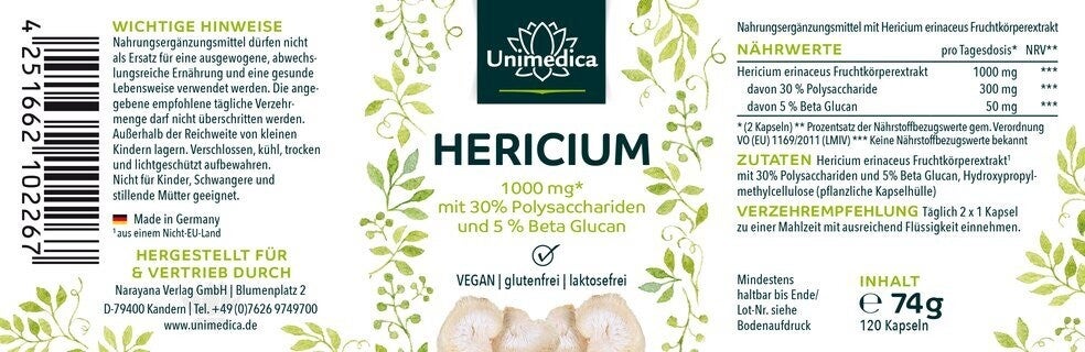 Hericium Extrakt - 1000 mg pro Tagesdosis - mit 30% Polysacchariden und 5% Beta Glucan - 120 Kapseln - von Unimedica