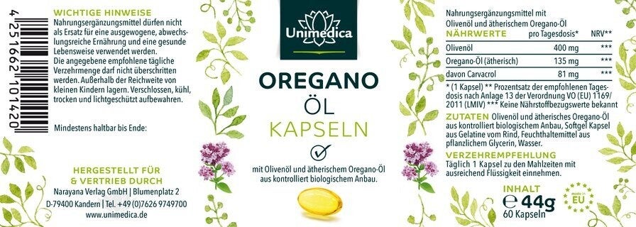 Im ätherischen Oregano-Öl sind die wertvollen Inhaltsstoffe und das typische Aroma konzentriert. Mit Olivenöl vereint bietet ätherisches Oregano-Öl mit seinem hohen Carvacrol-Gehalt in den Oregano-Öl Kapseln von Unimedica viele Vorteile des mediterranen Lebensstils einfach zum Einnehmen.