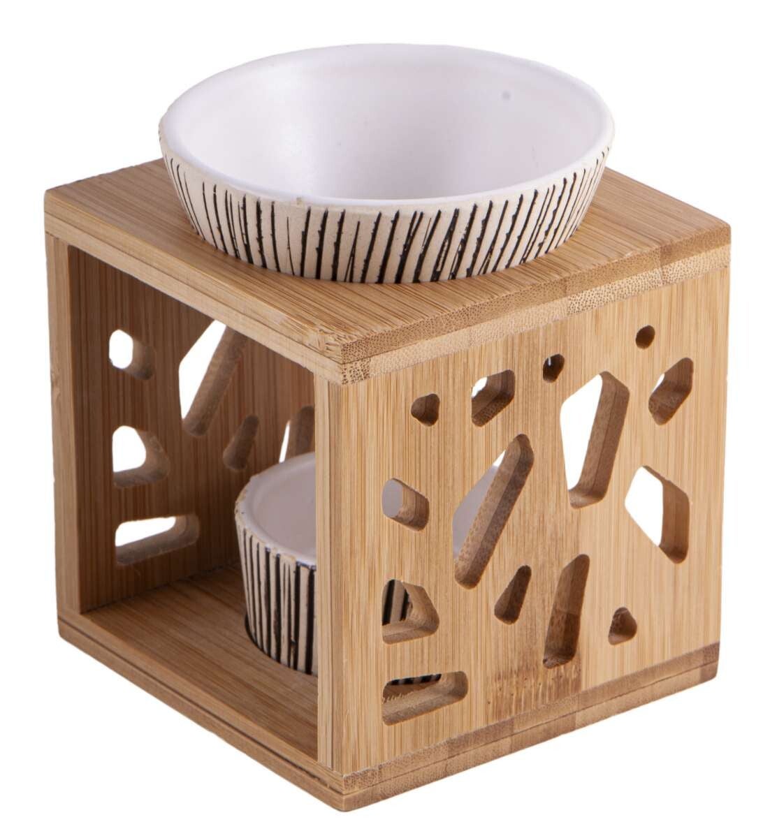 Elegante Aromalampe aus Bambus mit Keramik. Bambus gilt als Symbol für Lebenskraft und Lebenswillen. So wird der sinnliche Vorgang des duftenden Geschehens mit Kraft und Stärke gefüllt. In Geschenkbox.