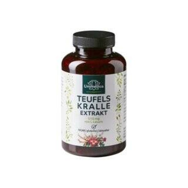 Teufelskralle Extrakt 510 mg mit L-Leucin Kapseln von Unimedica enthalten je Kapsel 510 mg Teufelskralle Extrakt mit 1,17% Harpagosiden (Bitterstoffe). Die Teufelskralle ist in Afrika beheimatet und gehört zu den Sesamgewächsen. Volksmedizinisch verwendet wird nur die Wurzel der Teufelskralle. Jede Dose Teufelskralle Extrakt 510 mg mit L-Leucin Kapseln von Unimedica enthält 180 Kapseln. Das entspricht einem 2-Monats-Vorrat.